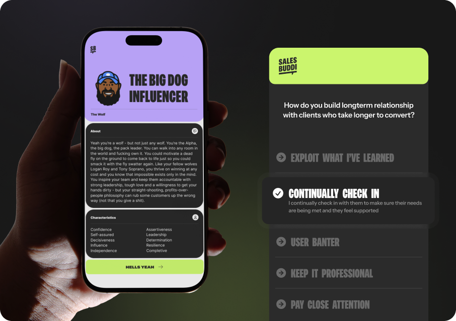Sales Buddi adapts its personality, tone, and tactics based on your type. Whether you’re a “Charming Closer” or a “Strategic Thinker,” Buddi matches your vibe and helps you master your edge.
